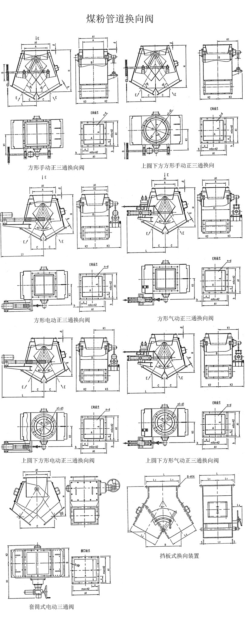 方形手動正三通換向閥、上圓下方形手動正三通換向閥、方形氣動正三通換向閥、上圓下方形氣動正三通換向閥、方形電動正三通換向閥、上圓下方形電動正三通換向閥、套筒是電動三通閥、擋板式換向裝置。