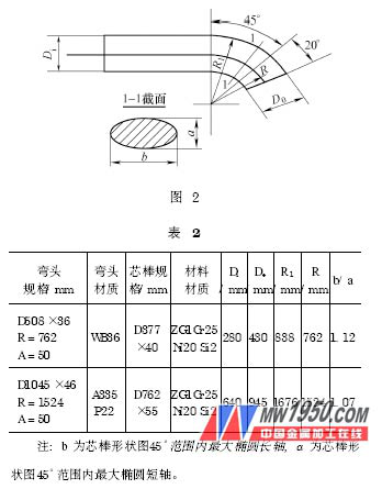 (3) 為保證合適的曲率半徑R 值,推進速度≤1000 δ/2 D,上述規格的WB36 彎頭的推制速度35 38mm/ minA335P22 彎頭的推制速度20 22mm/ min,芯棒頭整形段曲率半徑Rx =1. 06 1. 07 R
