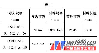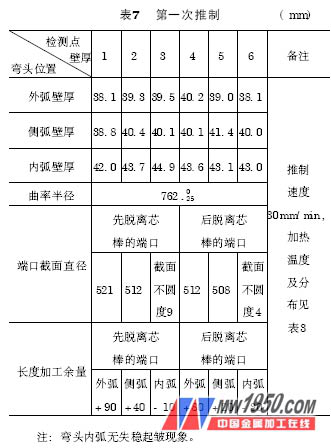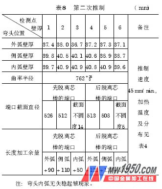 ( 5) 推制彎頭的檢測結果及分析 對推制彎頭用測厚儀檢測了外弧、側弧和內弧壁厚,用平臺劃線方式檢測了曲率半徑、端口截面直徑和長度加工余量。D508mm×36mmR = 762mmA = 50mm WB36彎頭的檢測結果如表7 、表8 所示。