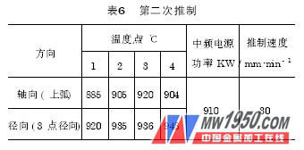 溫度分布是一個重要的工藝參數,由感應圈形狀及感應圈與芯棒頭相對位置直接控制。感應圈形狀是主要因素,感應圈與芯棒頭相對位置是次要因素。溫度沿芯棒頭軸向分布規律為低、中、高、中,溫度沿芯棒頭徑向分布規律為低、中、高。加熱溫度高,推制彎頭壁厚增大。推制D508mm×36mmR = 762mmA = 50mmWB36 鋼的試驗溫度如表3 、表4 所示。