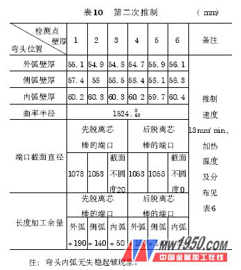 從表9 、表10 的對比中: 推制速度加快9mm/ min,曲率半徑加大84mm,即推制速度加快,曲率半徑加大。推制速度加快,加熱溫度升高,壁厚減薄5mm,即加熱溫度升高,壓縮量增大,推制速度加快,壓縮量減少。先脫離芯棒的端口,截面不圓度減少20mm,即推制速度降低,溫度升高,與模具貼合性能增強。