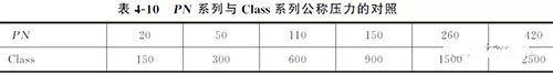 PN 和Class后面的數字并不代表法蘭實際所能承受的工作壓力,對于管路補償接頭給定的PN 或Class法蘭的最大允許工作壓力要根據法蘭材料和工作溫度,在相應法蘭標準的壓力-溫度額定值中查取。PN 系列與Class系列間的相互對應關系見表4-10。
