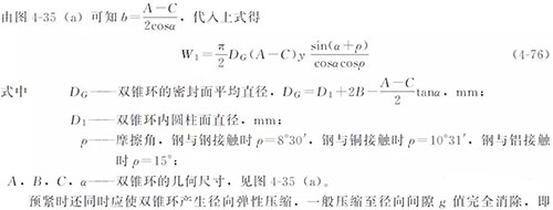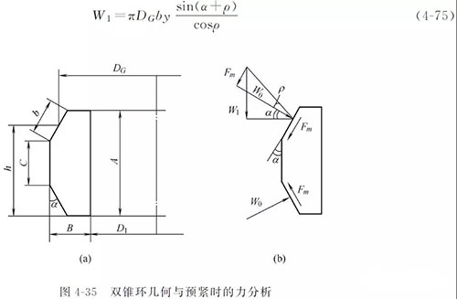為達到初始預緊密封,雙錐密封面上必須施加的法向壓緊力W0=πDGby。預緊時,雙錐環收縮,與頂蓋有相對滑動趨勢,使雙錐環受到摩擦力Fm 的作用,管路補償接頭的摩擦力的方向如圖4-35所示,其大小為Fm =W0tanρ=πDGbytanρ。Fm 和W0 作矢量合成后再分解到垂直方向就是預緊時主螺栓必須提供的載荷W1,即