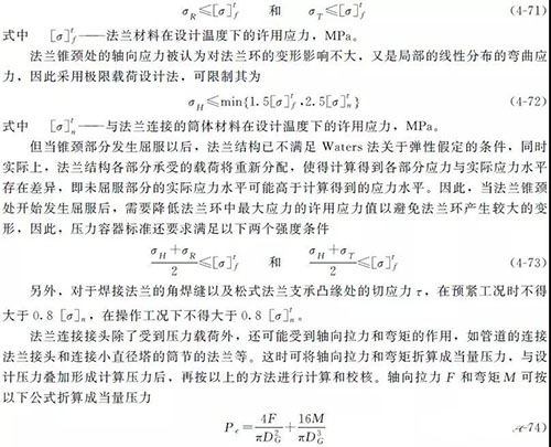 在壓力容器設計中,對于法蘭連接結構,不但要避免其強度失效,更要避免其密封失效。因此,壓力容器標準中法蘭設計規定的強度條件實際上是采用管路補償接頭的限制法蘭環中的應力來同時限制法蘭變形。