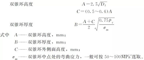 該結構中雙錐環可選用20、25、35、16Mn、20MnMo、15CrMo及0Cr18Ni9等材料制成,在其兩個密封面上均開有半圓形溝槽,并襯有軟金屬墊,如退火鋁或退火紫銅等。合理地設計雙錐環的尺寸,使其有適當的剛性,保持有適當的回彈自緊力是很重要的。