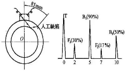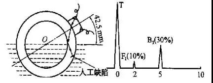 將探頭置于樣管上,找到人工缺陷,將一次通波B1調(diào)到5格,幅度為滿幅的90%,二次通波B2調(diào)到10格,管路補(bǔ)償接頭幅度為滿幅的50%;—次缺陷波F1在2格處,幅度為滿幅的30%,二次缺陷波F2在7格處,幅度為滿幅的17%(圖1)。