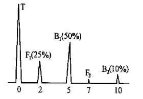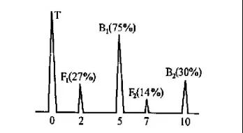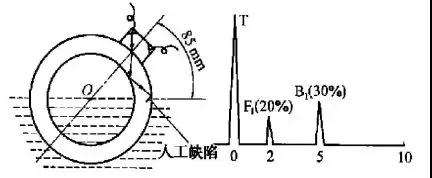 (2) 繼續(xù)加水至樣管直徑的1/2處,并保持探頭與人工缺陷相對(duì)位置不變,旋轉(zhuǎn)樣管使人工缺陷剛好浸入水中,此時(shí)波幅變化如圖5所示。可見,降至滿幅的30% (-9.5dB), F1降至滿幅的20% (-3.5dB);B2和F2同樣全部消失。管路補(bǔ)償接頭在水量增加,且人工缺陷也被水所浸的情況下,B1與F1較原始狀態(tài)下降幅度驟增,更加證明了水浸探傷時(shí)能量衰減嚴(yán)重。