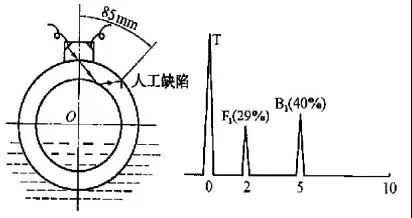 管路補(bǔ)償接頭此狀態(tài)下,探頭中心線至人工缺陷的周向距離為85mm,衰減器讀數(shù)為38dB。我們將此狀態(tài)定為原始狀態(tài),下面分三種情況進(jìn)行試驗(yàn)。
