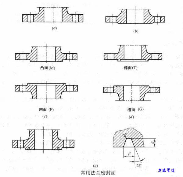 法蘭密封面基本類(lèi)型如圖所示,至于法蘭與管子的連接方式,可以忽略圖中的表達(dá)方式,因?yàn)橥环N密封面的法蘭,由于技術(shù)參數(shù)的不同,與管子有不同的連接方式。而要圖示表達(dá)密封面,又不得不把整個(gè)法蘭畫(huà)出來(lái)。