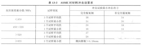 因而對高強度鋼而言,不同的鋼種應分別對指標進行校正(或附加側向膨脹量≥0.38mm) ,這種觀點在ASME 規(guī)范1977年版本已有反映。表13 - 3 所列為現(xiàn)行ASME VIII - 1對低溫鋼夏比(V 形缺口)沖擊試驗的最小沖擊功值。