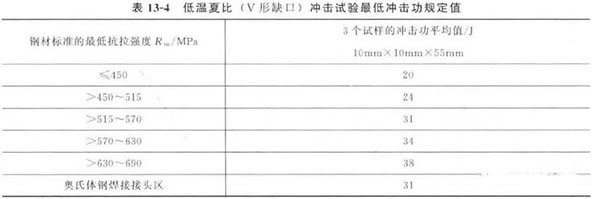 ④ 沖擊功指標  鋼材試驗溫度下的沖擊功指標,按鋼材標準規(guī)定的最低抗拉強度確定,具體要求必須滿足表13-4 的規(guī)定。小試樣的沖擊功指標根據(jù)試樣寬度按比率縮減。