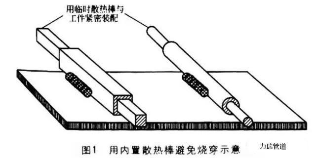 有,主要是在焊接過程中采用一個散熱棒。如將一個實心圓棒插入薄壁圓管中,或?qū)⒁粚嵭木匦伟舨迦刖匦喂芗校瑢嵭陌魧ё弑”诠ぜ臒崃坎⒎乐篃R话銇碚f,在多數(shù)供貨的中空管或矩形管材料中都緊密安裝了實心圓棒或矩形棒。焊接時應(yīng)注意將焊縫遠離管子的末端,管子的末端是最易發(fā)生燒穿的薄弱區(qū)域。用內(nèi)置散熱棒避免燒穿的示意如圖1所示。