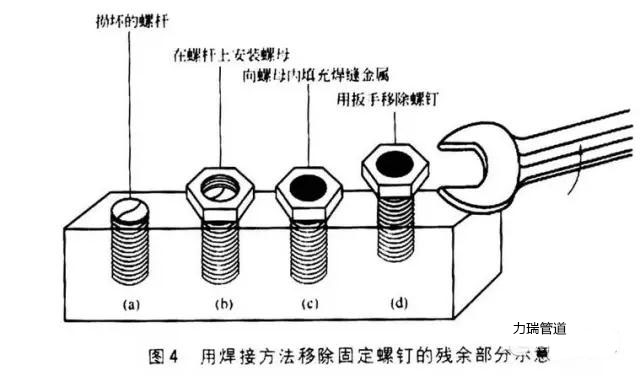 ② 如果螺釘槽、螺母或牙槽損壞或丟失,可以在螺釘頭的上部(或殘余部分)放置一個螺母,旋緊螺母,然后采用任何焊接方法在螺母和螺釘?shù)膬?nèi)部填充金屬。這樣就會將螺母和螺釘殘余部分連接起來,然后在螺母上放置扳手或牙鉗,迅速拔出螺釘。采用這種方法有利于提供一個新的握力點并可利用熱量使螺釘緊固,用焊接方法移除固定螺釘?shù)臍堄嗖糠质疽馊鐖D4所示。