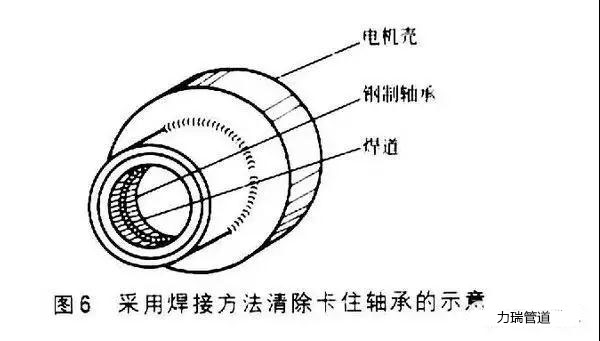 首先在軸承的內(nèi)表面焊接一條焊道,靠焊道拉伸力減小軸承直徑,外加焊接過程的熱量應(yīng)可使軸承活動。直徑10cm的管如果在內(nèi)表面布滿焊道將會使鋼管直徑收縮1.2mm。采用焊接方法清除卡住軸承的示意如圖6所示。