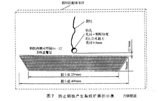 首先在裂紋末端鉆一個小孔,以利于在較大的范圍內(nèi)分散末端的應(yīng)力,然后焊接一系列長度不等的多道焊縫,增加裂紋前端鋼板的強度。防止鋼板產(chǎn)生裂紋擴展的示意見圖7。