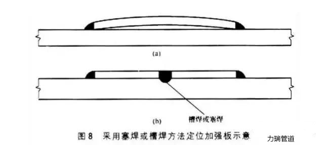 解決的方法是在加強板中間部位采用塞焊或槽焊,將加強板表面與基板表面貼緊,消除變形以利于進行機械加工。采用塞焊或槽焊方法定位加強板示意如圖8(b)所示。