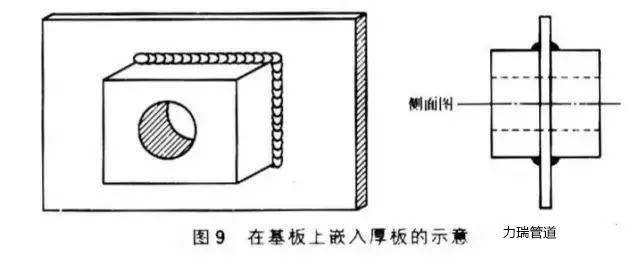 將一厚板金屬嵌入基板需要加厚的部位,然后采用焊接方法進行固定。在基板上嵌入厚板的示意見圖9。這樣可以給后續(xù)的機械加工、鏜削加工或鉆孔提供足夠的厚度,并可以代替設(shè)備中的大厚度零件或鑄造件。