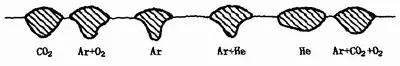 圖1—35 保護氣體成分對焊縫形狀的影響