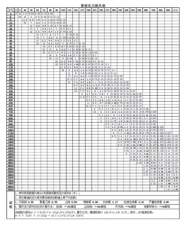 一般情況下90度彎管比120度彎管阻力大,每一90度彎管揚程損失約0.5-1米,每20米管道的阻力可使揚程損失約1米。此外,有部分用戶還隨意更改水泵進、出管的管徑,這些對揚程也有一定的影響。那,管道阻力對揚程的影響究竟有多大呢?下面,我們來看下方表格。