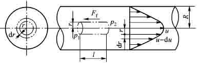 如上圖所示,液體在直徑d的圓管中作層流運動,圓管水平放置,在管內(nèi)取一段與管軸線重合的小圓柱體,設(shè)其半徑為r,長度為l。在這一小圓柱體上沿管軸方向的作用力有:左端壓力p1,右端壓力p2,圓柱面上的摩擦力為Ff。則其受力平衡方程式為: