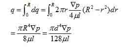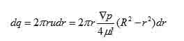 圖(b)所示拋物體體積,是液體單位時間內(nèi)流過通流截面的體積即流量。為計算其體積,可在半徑為r處取一層厚度為dr的微小圓環(huán)面積,通過此環(huán)形面積的流量為: