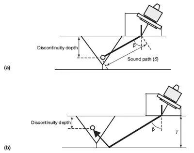 我們使用簡單的幾何公式,基于折射角(β)、聲程(S)和基體金屬的厚度(T)來計算不連續面的深度: