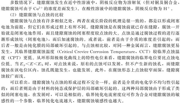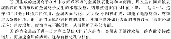 縫隙內金屬產生的一種局部腐蝕形態,總稱為縫隙腐蝕。縫隙包括金屬與金屬間形成的縫隙、金屬與作為法蘭盤連接墊圈等的非金屬材料 (塑料、橡膠、玻璃、纖維板等)接觸所形成的縫隙,以及腐蝕產物、砂粒、灰塵、污物、海生物等沉積或附著在金屬表面上所形成的縫隙等,在一定電解質溶液中都會在縫隙的局部范圍內產生嚴重的腐蝕。