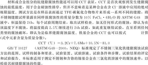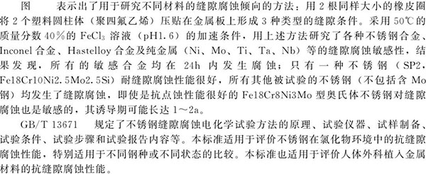 評價材料抗縫隙腐蝕性能的標準方法主要有浸泡試驗和電化學試驗。對于浸泡試驗法,設計形式多樣的人造縫隙,采用多種腐蝕介質,一般以腐蝕質量或腐蝕深度評定試驗結果;電化學測試方法是以某些電化學參數作為判據,來比較金屬材料對縫隙腐蝕的相對敏感性,一般來說,電化學測試方式可縮短縫隙腐蝕的誘導期而達到加速腐蝕試驗的目的。浸泡試驗法包括三氯化鐵實驗、縫隙腐蝕的加速試驗方法、多縫隙腐蝕試驗、 MTI 試驗、 CCT 法等;電化學測試方法包括 ASTM 標準試驗方法、恒電位試驗、動電位極化試驗法、遠距離縫隙裝置試驗等。