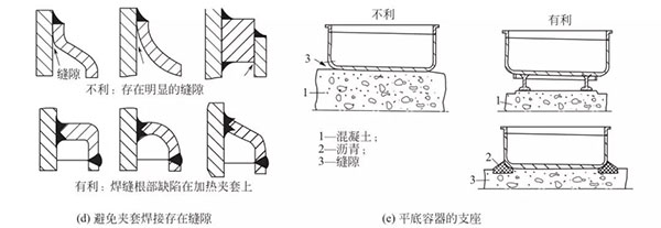 在壓力容器的設計與制造工藝上盡量不造成縫隙結構是避免其受到縫隙腐蝕最有效的方法。盡可能避免采用金屬和非金屬的連接,設計上盡量采用滿焊結構,用焊接代替鉚接或螺栓連接;用對接焊接不用搭接;搭接焊的縫隙要用連續焊、釬焊或捻縫的方法將其封塞。焊接時,在接觸溶液的焊縫一側盡量避免孔洞、未熔合和裂紋等缺陷。應保證容器在排空時無殘留溶液存在,設計上避免銳角和靜滯區 (死角)使結構能夠完全排流,以防生物或碎屑等在這些部位的集積,或出現沉淀時能及時清除;用不腐蝕的堵縫劑或用焊接來封閉已存在的縫隙;連接部件的法蘭盤墊圈采用非吸水性材料 (如在可能的條件下采用聚四氟乙烯等材料);在裝配前,接合面要刷涂料或覆蓋涂層、堆焊耐縫隙腐蝕材料。圖 4-47 為防止縫隙腐蝕可采用的幾種方法示意圖, (a)為螺栓連接,采用密封膠填充縫隙,消除緊固件縫隙;(b)管板式換熱器,管板與管束脹接段盡可能完全與管板厚度一致;( c )管子采用對接而不用插接;(d)避免夾套焊縫與筒體間產生縫隙;( e )容器采用支座支撐,如平底容器底部直接坐于地面,應采取措施填充底部與地面的縫隙。