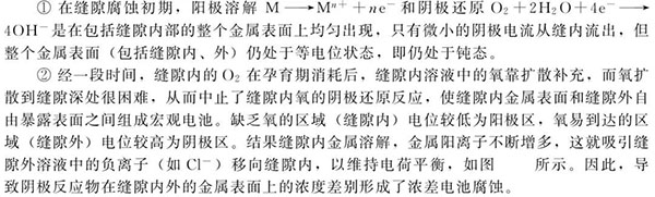 現在普遍為大家所接受的縫隙腐蝕機理是氧濃差電池與閉塞電池自催化效應共同作用的結果。腐蝕開始時,縫內、外氧濃差增加,縫內金屬的電位變負,使縫內陽極溶解速度增