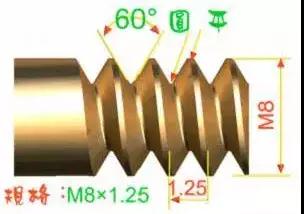 我國國家標準 CNS 采用之螺紋。牙頂為平面,易于車削,牙底則為圓弧形,以增加螺紋強度。螺紋角為60度,規(guī)格以M表示。公制螺紋可分粗牙及細牙兩種。表示如 M8x1.25。(M:代號、8:公 稱直徑、1.25:螺距)。