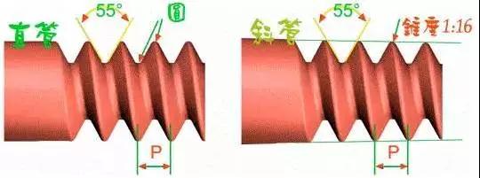 為防止泄漏用的螺紋,經(jīng)常用于氣體或液體之管件連結。螺紋角為 55 度,可分為直管螺紋代號為”P.S.、N.P.S.”和斜管螺紋代號為“N.P.T.”,其錐度為 1:16,即每尺 3/4 寸。