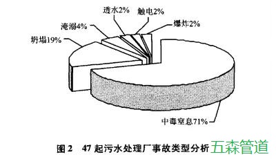 通過(guò)對(duì)47起收集的污水廠事故案例進(jìn)行分類與總結(jié),我們可以從中看出,事故發(fā)生的原因排在第一位的是中毒窒息,一共是29起,是總事故的75%,第二位是因?yàn)闃?gòu)筑物坍塌,發(fā)生了6起,是總事故的17%;第三位是淹溺事故,發(fā)生了2起,是總事故的7.5%;除此之外,還有透水、觸電、爆炸事故等,均發(fā)生了1起,是總事故的3%。由此分析結(jié)論可以看出,污水處理廠事故的主要類型是中毒窒息事故,這也是污水處理廠安全生活狀況改變的重點(diǎn)和難點(diǎn)。
