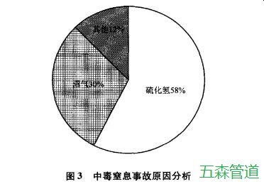 分析研究中分別對(duì)中毒窒息的物質(zhì)進(jìn)行了統(tǒng)計(jì)與分類。結(jié)果表明占總事故數(shù)57%的是硫化氫引起的中毒事件。占總事故31%的是沼氣引起的中毒事件。其他原因引起的事故占12%,經(jīng)過(guò)分析還可以發(fā)現(xiàn)的是硫化氫引起的主要是中毒事故,沼氣引起的主要是窒息事故。