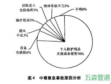 通過(guò)對(duì)總事故中中毒窒息事故的分析與統(tǒng)計(jì)我們可以看出,工作人員的個(gè)人防護(hù)用品沒(méi)有按照規(guī)定檢查失效,以及沒(méi)有使用是事故造成人員傷亡的主要原因,占總數(shù)的78%,污水處理廠運(yùn)行的設(shè)備有缺陷也是造成事故中人員傷亡的原因之一,占總數(shù)的7%。由于通風(fēng)不良、或者錯(cuò)誤的操作、在有危險(xiǎn)的情況下冒險(xiǎn)進(jìn)入危險(xiǎn)場(chǎng)所、物品存放不恰當(dāng)?shù)冗@些原因也都是會(huì)引起中毒窒息事故的發(fā)生的,就上述情況來(lái)看,為了減少中毒窒息對(duì)人員傷亡事故的發(fā)生,保證工作人員的防護(hù)用品有效、并且正確的使用是關(guān)鍵的手段。