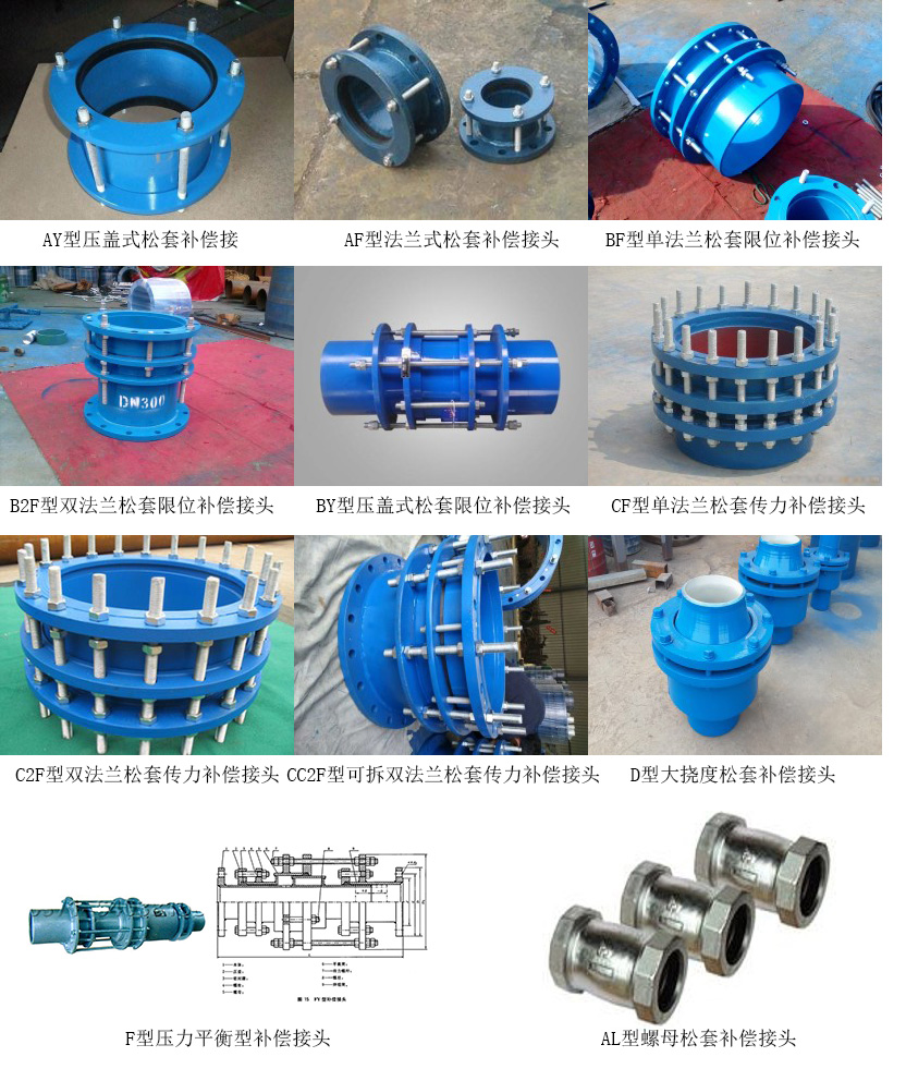 Al型螺母松套補償接頭、AY型壓蓋式松套補償接頭、AF型法蘭式松套補償接頭、BF型單法蘭松套限位補償接頭、B2F型雙法蘭松套限位補償接頭、BY型壓蓋式松套限位補償接頭、CF型單法蘭松套傳力補償接頭、C2F型雙法蘭松套傳力補償接頭、CC2F型可拆雙法蘭松套傳力補償接頭、D型大撓度松套補償接頭、FY型壓蓋式壓力平衡型補償接頭、FT型填料函式壓力平衡型補償接頭 |