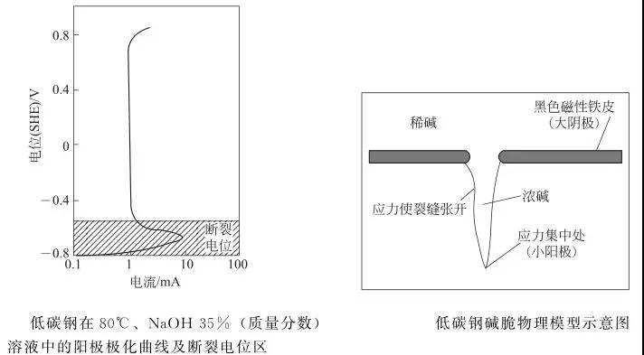 低碳鋼鋼在沸騰的質(zhì)量分數(shù)為35%~40% NaOH 溶液中堿脆的敏感電位范圍為-1150~800mV ( SCE ),在沸點 ( 120℃ )下鋼的堿脆發(fā)生在 -700mV ( SCE )左右的很窄電位范圍內(nèi),如下圖所示。