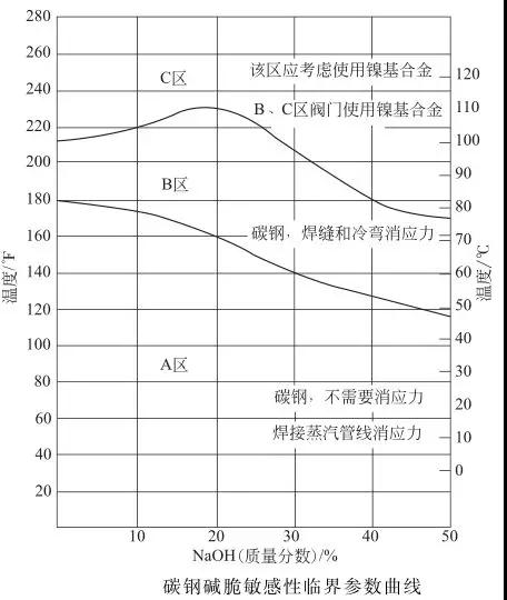 下圖為金屬堿脆敏感性臨界參數(shù)曲線,碳鋼在溫度低于 46℃ 的環(huán)境不會發(fā)生堿脆。在溫度高于 82℃ ,且 NaOH 質(zhì)量分數(shù)大于 5% 時,有很高的開裂敏感性。關于溫度的影響,需要考慮的是金屬接觸堿液的實際溫度,而不僅僅是正常的工藝溫度,有許多常溫輸送堿液管道,在安裝有蒸汽伴熱的情況下,發(fā)生過堿脆。