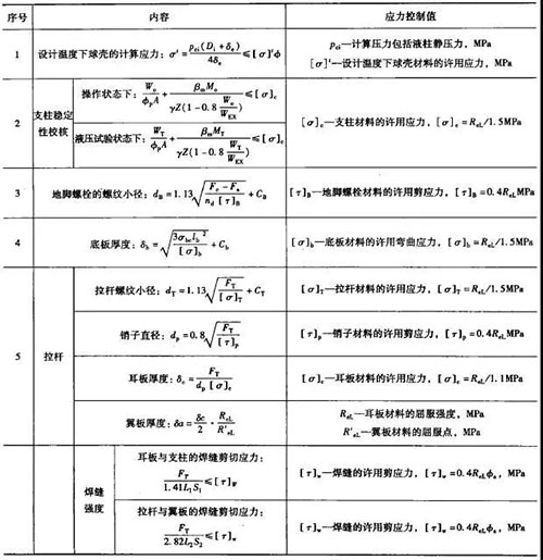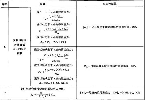 (5) 球罐設計校核內容及應力控制值,見下表: