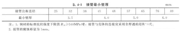 接管的厚度除要考慮上述要求外,還需考慮焊接方法、焊接參數、加工條件、施焊位置等制造上的因素及運輸、安裝中的剛性要求。