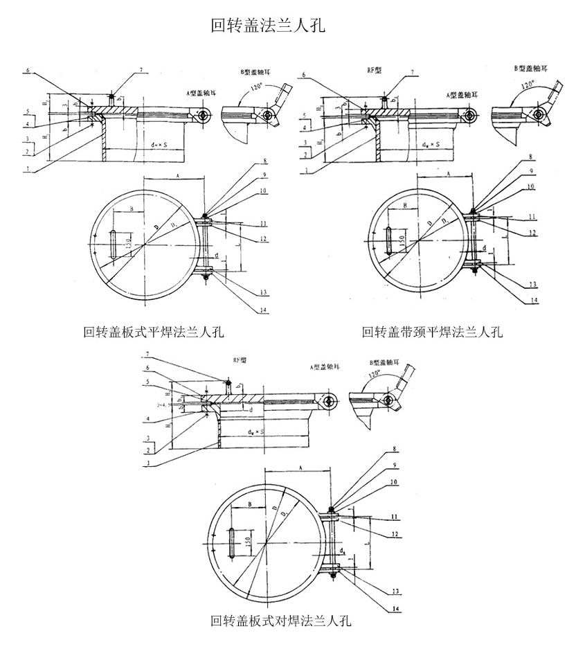 回轉(zhuǎn)蓋板式平焊法蘭人孔、回轉(zhuǎn)蓋帶頸平焊法蘭人孔、回轉(zhuǎn)蓋帶頸對(duì)焊法蘭人孔