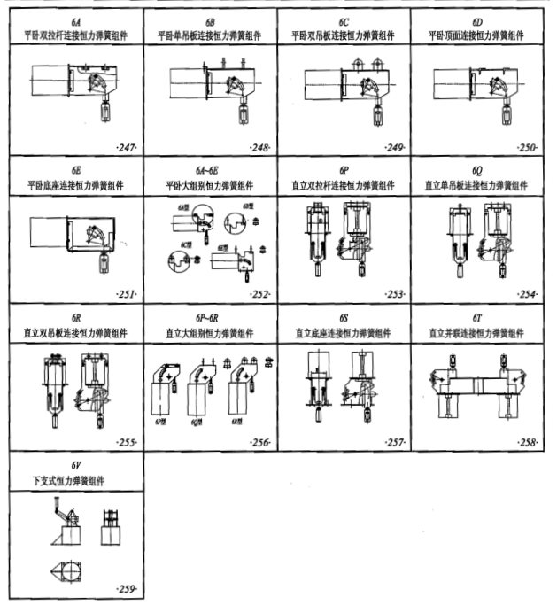 D-6A平臥雙拉桿連接恒力彈簧組件、6B平臥單吊板連接恒力彈簧組件、6C平臥雙吊板連接恒力彈簧組件、6D平臥頂面連接恒力彈簧組件、6E平臥底座連接恒力彈簧組件、6P直立雙拉桿連接恒力彈簧組件、6Q直立單拉桿連接恒力彈簧組件、6R直立雙吊板連接恒力彈簧組件、6S直立底座連接恒力彈簧組件、6T直立并聯連接恒力彈簧組件、6V下支式恒力彈簧組件